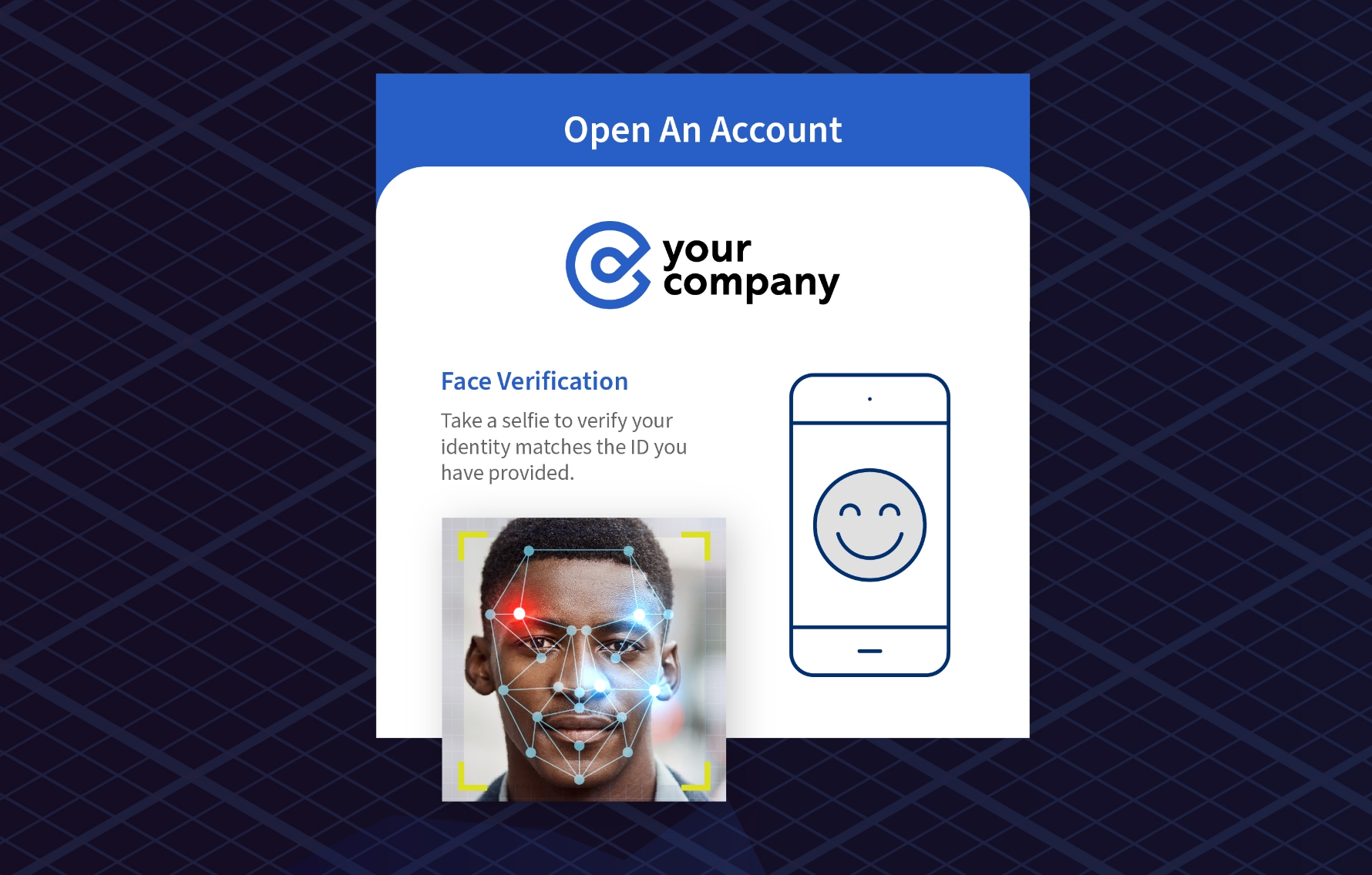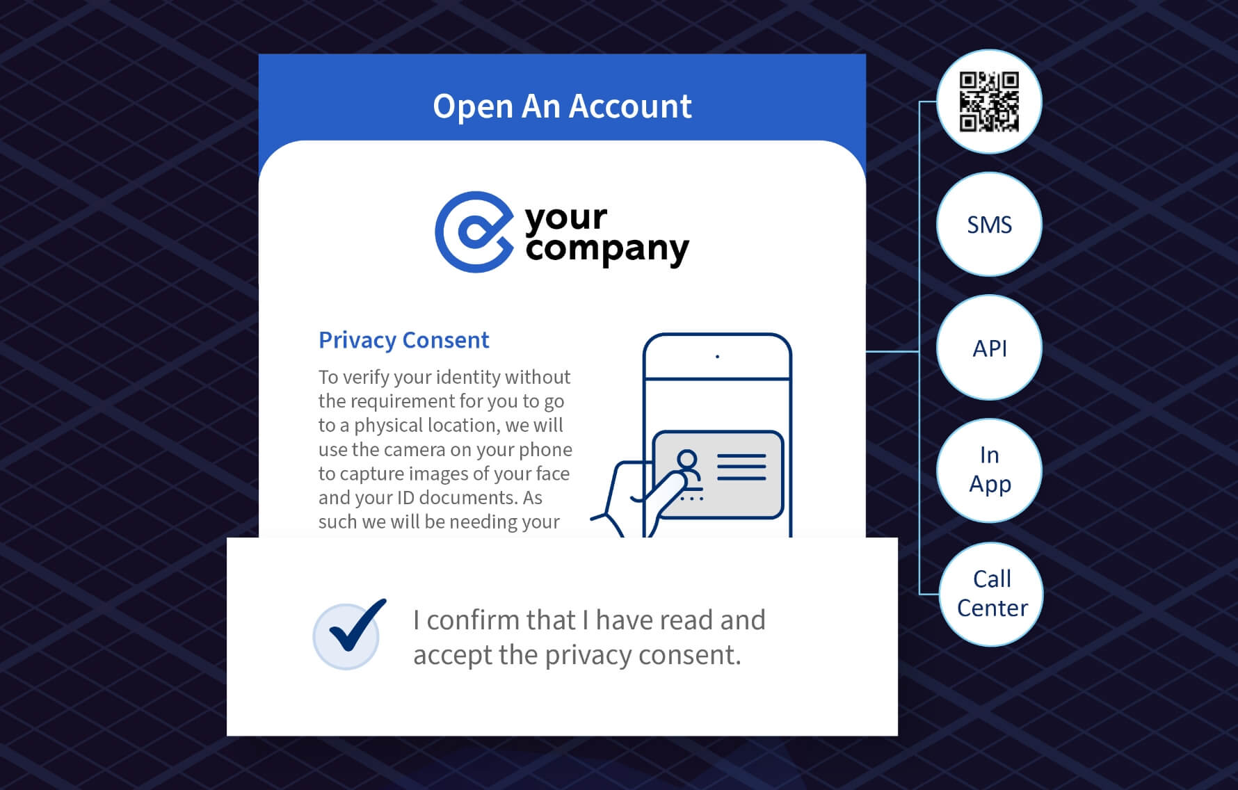 ユーザーはブランドイメージを保たれたままのUIで、認証を始めることができます。QRコードのスキャン、SMSテキストでリンクを受信、またはAPI経由で認証が開始され、IDカード撮影時は、特定のテンプレート(グリッド)に合わせる必要がありません。