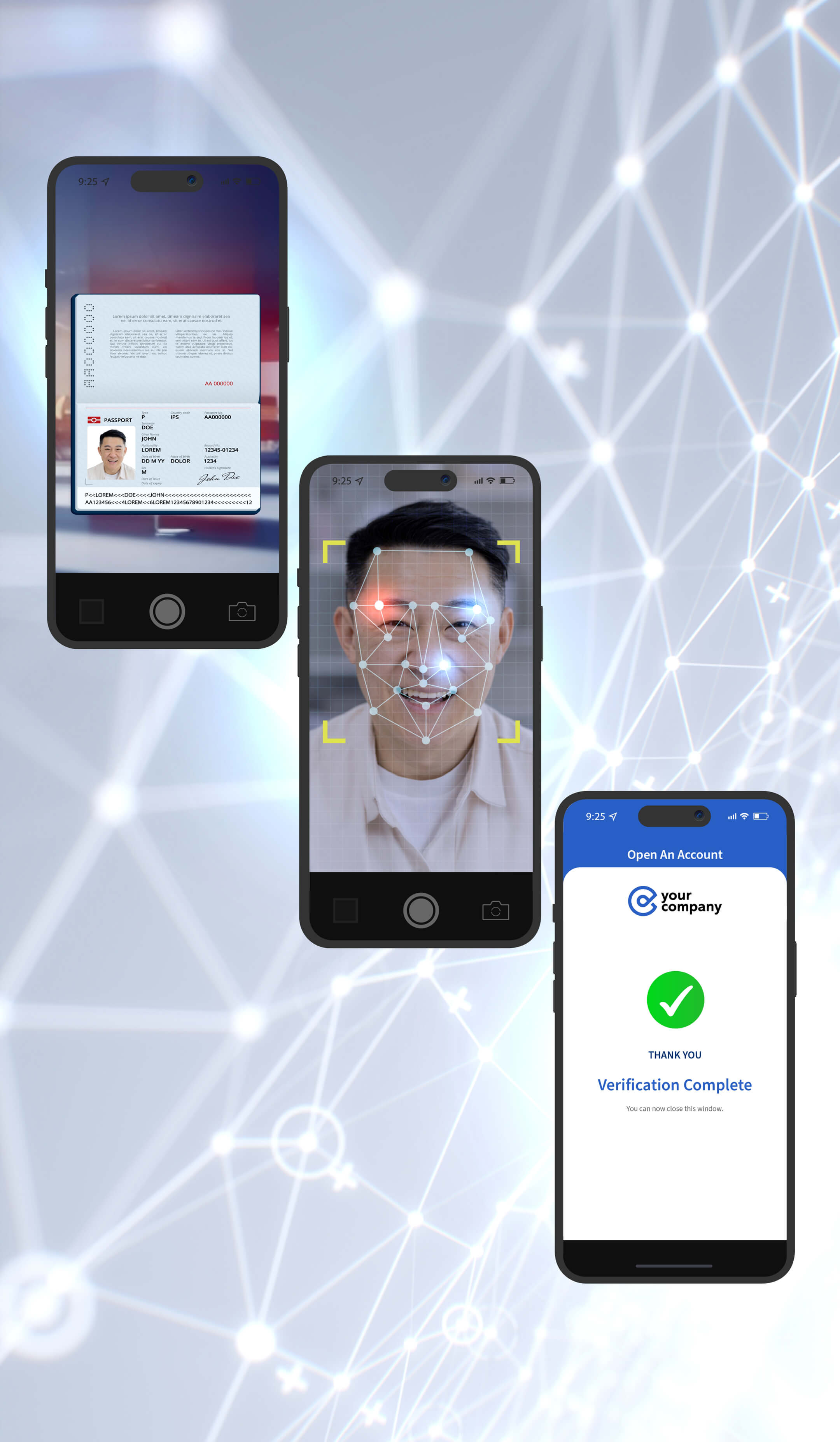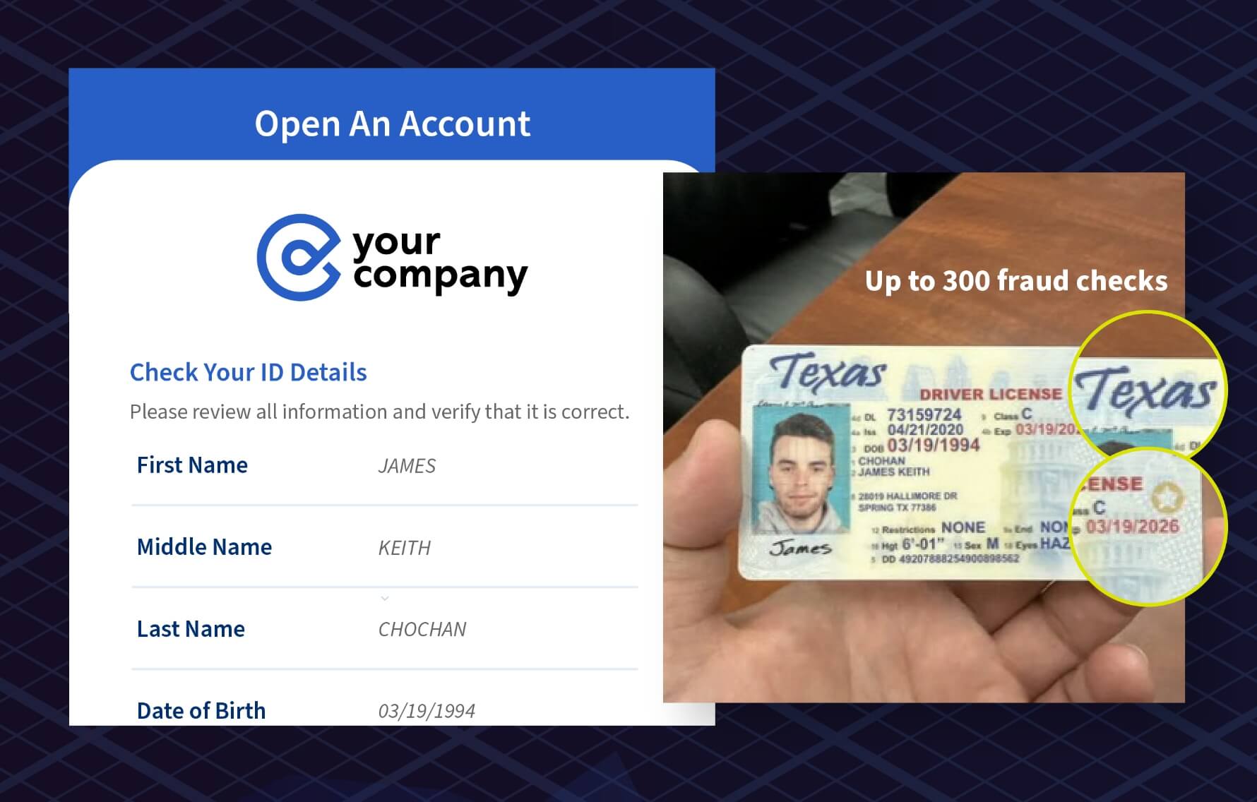 高度なOCRにより、全テキストを自動抽出します。人手による入力は不要です。認識精度は、人間可読で98.5%以上、機械可読で99.98%です。最大300項目の不正チェックを同時に行い、書類の真正性を確認します。